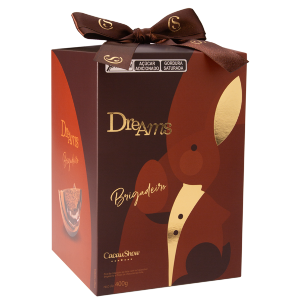 Revisitando um clássico brasileiro, o Ovo de Páscoa Dreams Brigadeiro de 400g contempla uma casca de chocolate ao leite recheada com um creme que remete ao brigadeiro tradicional, decorada com granulado de chocolate ao leite Belga. Custa R$93.99.