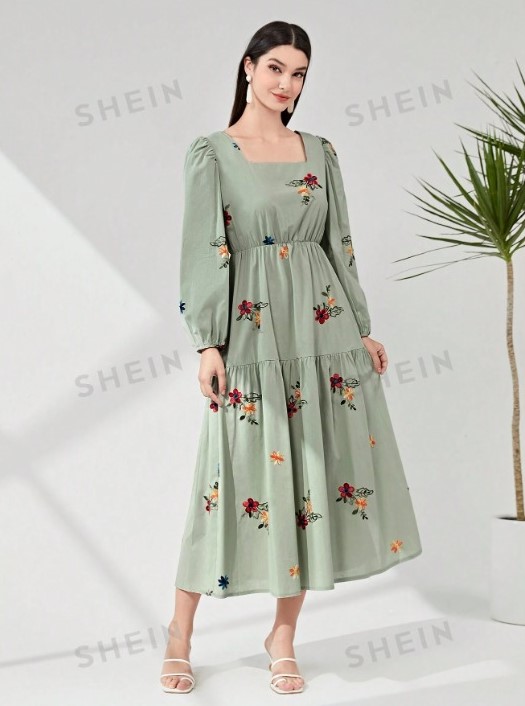 Em meio às promoções, emerge um vestido floral que parece pintado com a paleta da natureza: padrões de flores adornando um fundo verde-claro. Com mangas longas levemente franzidas e gola quadrada, a peça define a cintura sem comprometer o conforto.