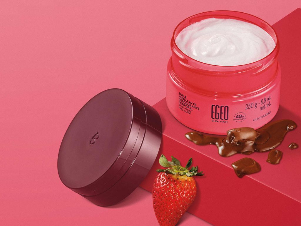 Parte da linha Egeo Choc, esse hidratante tem cheirinho de chocolate cremoso misturado com morango e extrato de cacau. A fragrância é da família oriental gourmand.