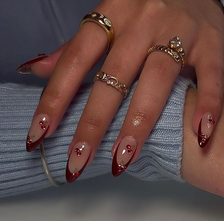 A base transparente ou nude destaca a ponta vermelha vibrante, enquanto os adesivos de cereja adicionam um elemento único e fora da caixa. Para deixar essas unhas ainda mais dramáticas, você pode usar diferentes tons de vermelho para criar um efeito de sombreamento nas pontas, criando um degradê.