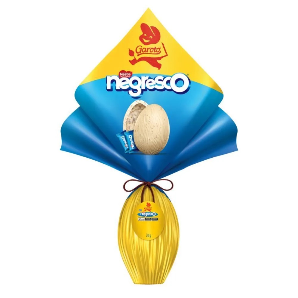 O Ovo de Páscoa Negresco é uma edição especial que combina a cremosidade do chocolate com a crocância do biscoito. Pesando 240 gramas, este ovo possui um design idealizado para se destacar tanto na prateleira quanto como um presente.