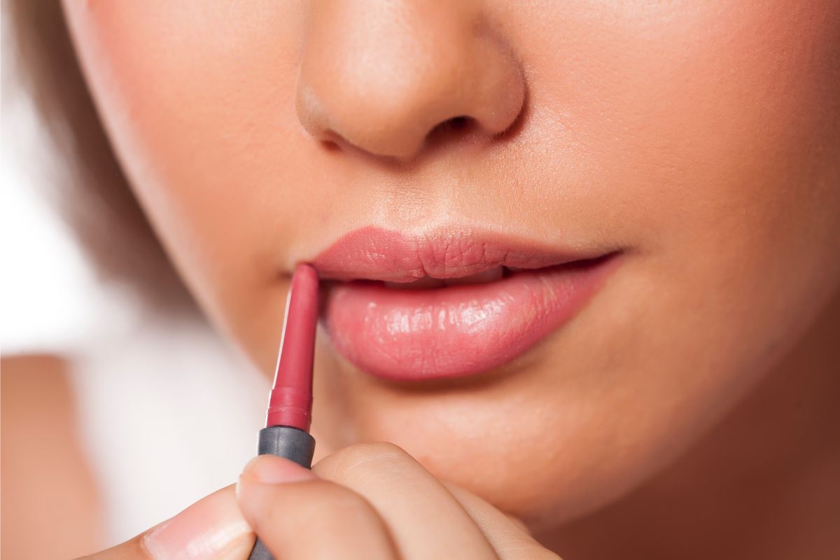 Com um lápis labial, faça um “X” no lábio de cima, usando o arco do cupido como guia, em seguida, vá contornando o restante dos lábios com cuidado. Após terminar, com a ponta do dedo, faça leves movimentos sobre o risco, deixando-o esfumado.