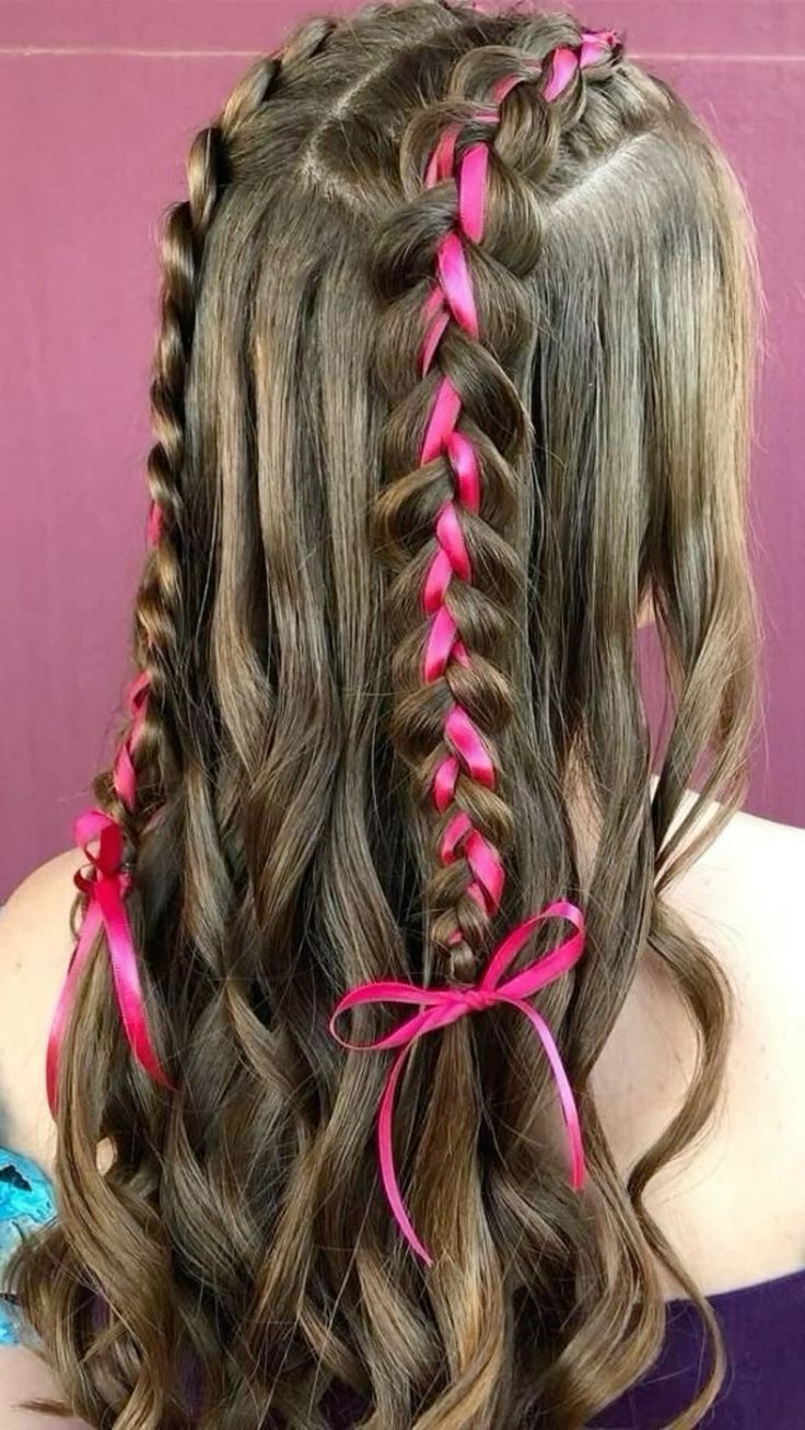 Por fim, as tranças soltas podem ser adornadas com fitas cor-de-rosa, formando laços ao longo do comprimento do cabelo.