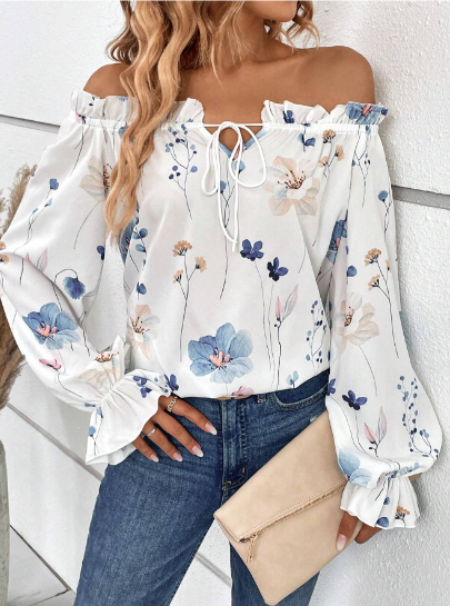 SHEIN VCAY Impressão Floral Fora Do Ombro Manga Flare Acabamento De Folho Amarração Frontal Blusa